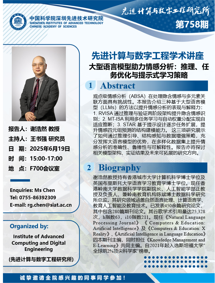 数字所/计算机学院758学术讲座将于6月19日15:00-17:00在F700会议室举行,本次讲座将邀请香港岭南大学 谢浩然 教授作题为“大型语言模型助力情感分析:推理、任务优化与提示式学习策略的报告。本次报告将由数字所 王书强 研究员主持,诚挚邀请大家参加、学习和研讨!