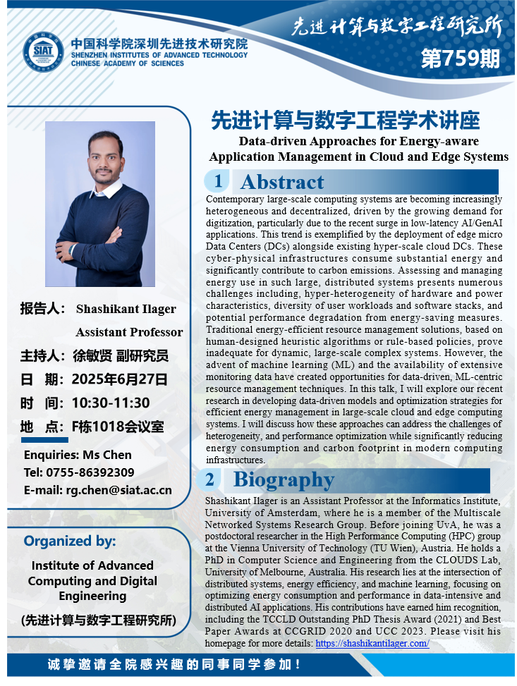 数字所/计算机学院759学术讲座将于6月27日10:30-11:30在F1018会议室举行,本次讲座将邀请阿姆斯特丹大学(University of Amsterdam)  Shashikant Ilager 助理教授作题为“Data-driven Approaches for Energy-aware Application Management in Cloud and Edge Systems的报告。
