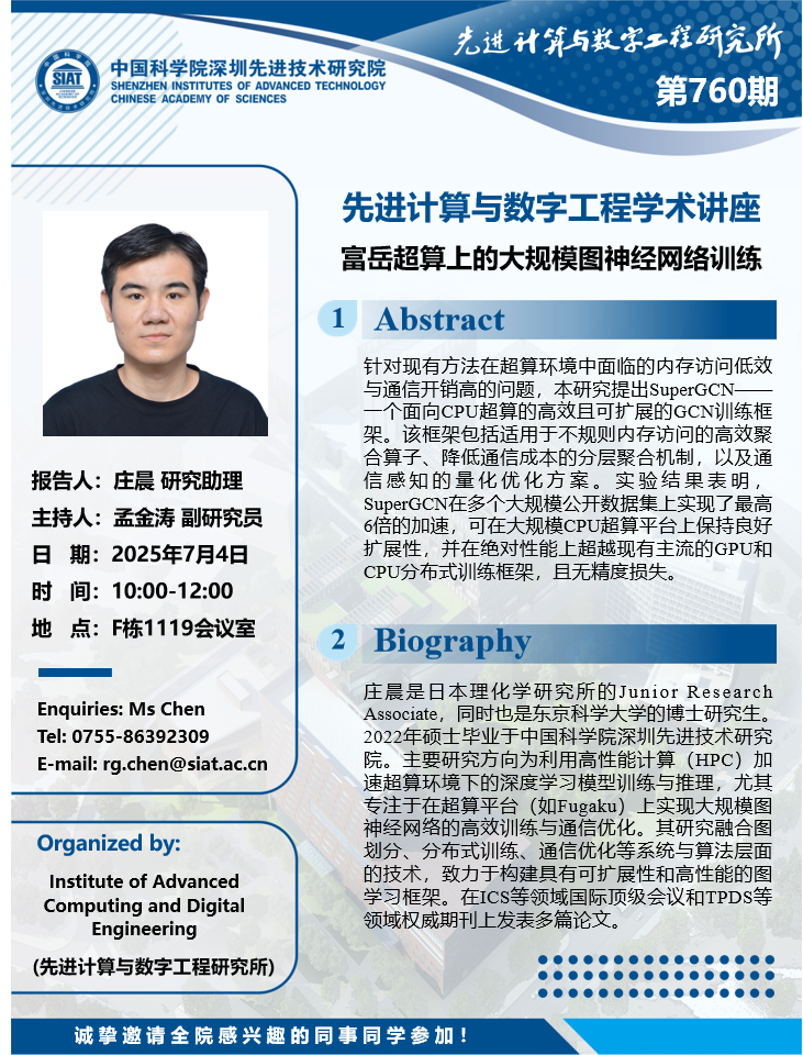 数字所/计算机学院760学术讲座将于7月4日10:00-12:00在F1119会议室举行,本次讲座将邀请日本理化学研究所 庄晨 研究助理作题为“富岳超算上的大规模图神经网络训练的报告。