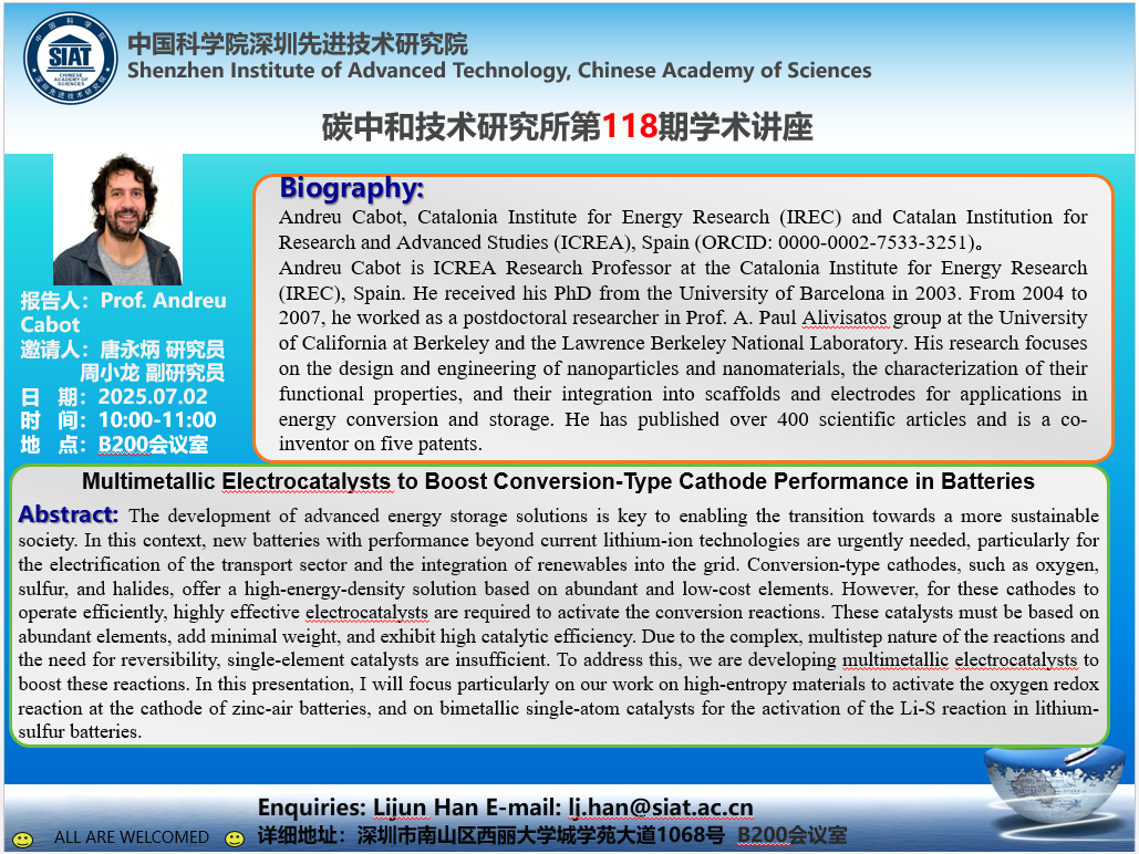 碳中和技术研究所第118期学术讲座将于 7月2日(周三)10:00-11:00B200会议室召开。本次讲座特邀西班牙加泰罗尼亚能源研究所 Prof. Andreu Cabot作题为《 Multimetallic Electrocatalysts to Boost Conversion-Type Cathode Performance in Batteries》的学术报告。