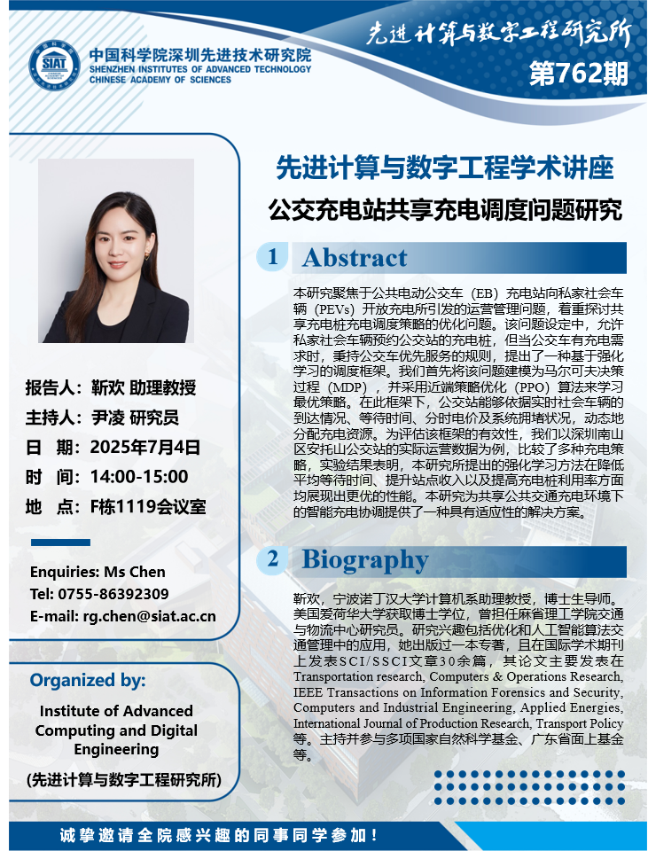 大家好!数字所/计算机学院762学术讲座将于7月4日14:00-15:00在F1119会议室举行,本次讲座将邀请宁波诺丁汉大学 靳欢 助理教授作题为“公交充电站共享充电调度问题研究的报告。