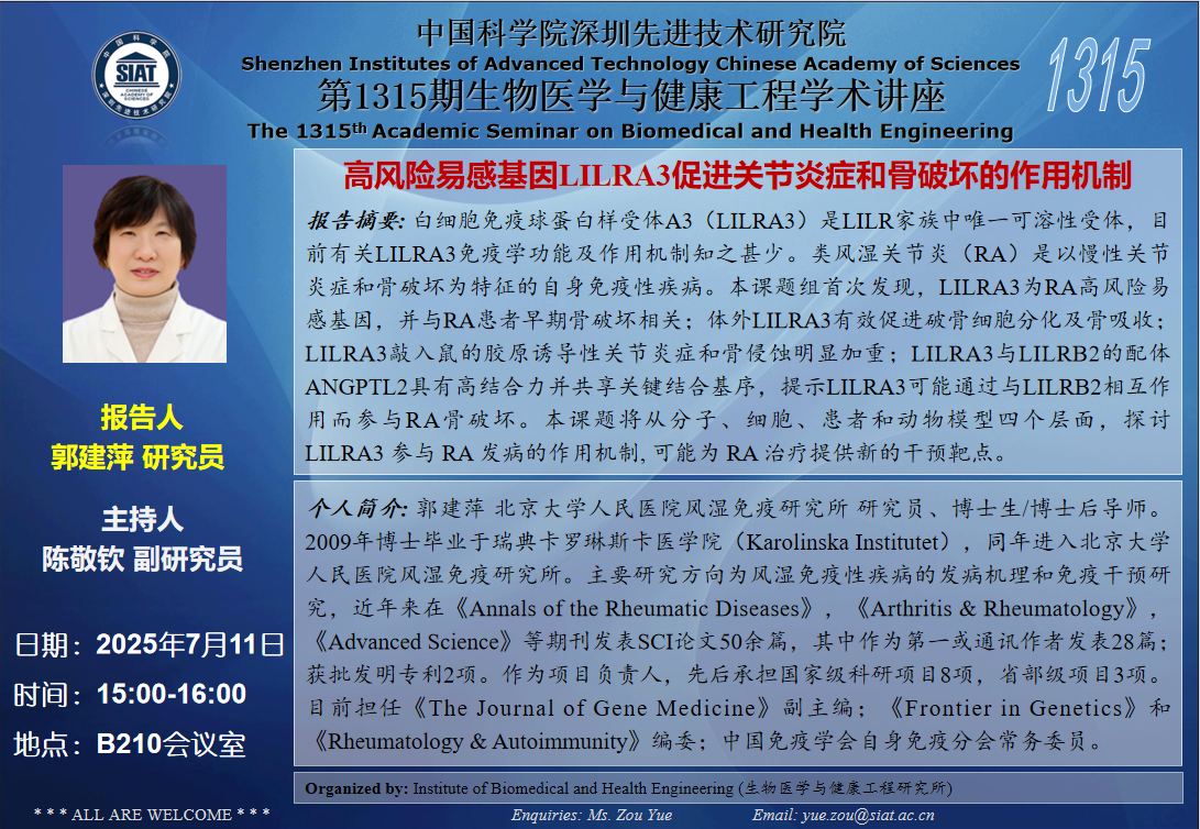 医工所第1315期学术讲座将于 2025年7月11日(周五) 15:00-16:00 B210会议室举行