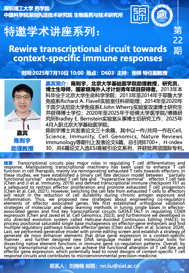 大家好!药学院/医药所“特邀学术讲座系列”第22期将于2025年07月10日(周四)10:00,在先进院D603会议室举行。本次讲座邀请了来自北京大学基础医学院的陈则宇 助理教授带来题为“Rewire transcriptional circuit towards context-specific immune responses”的报告。届时,张铎 副教授将主持讲座。