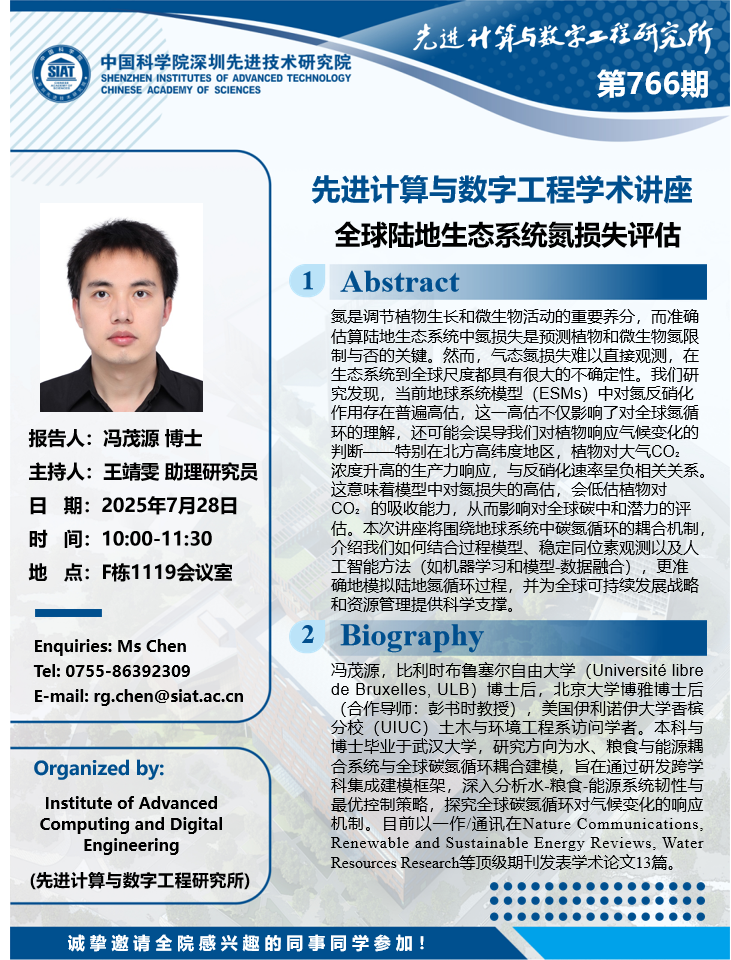 数字所/计算机学院766学术讲座将于7月28日10:00-11:30在F1119会议室举行,本次讲座将邀请比利时布鲁塞尔自由大学(Université libre de Bruxelles,ULB) 冯茂源 博士作题为“全球陆地生态系统氮损失评估的报告。本次报告将由数字所 王靖雯 助理研究员主持,诚挚邀请大家参加、学习和研讨!
