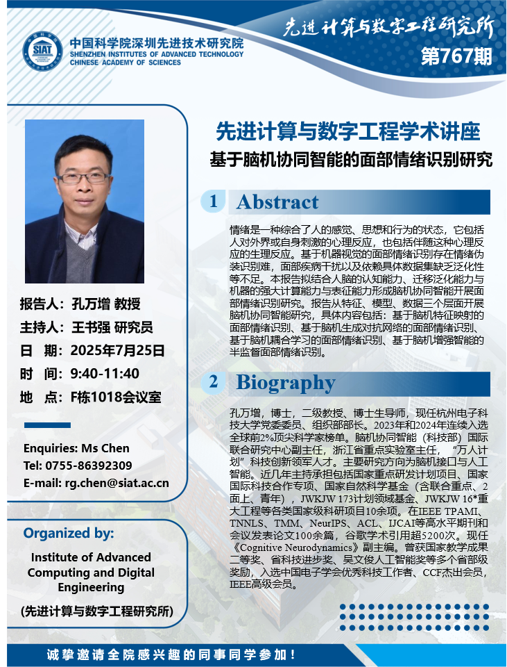 数字所/计算机学院767学术讲座将于7月25日9:40-11:40在F1018会议室举行,本次讲座将邀请杭州电子科技大学 孔万增 教授作题为“基于脑机协同智能的面部情绪识别研究的报告。本次报告将由数字所 王书强 研究员主持,诚挚邀请大家参加、学习和研讨!